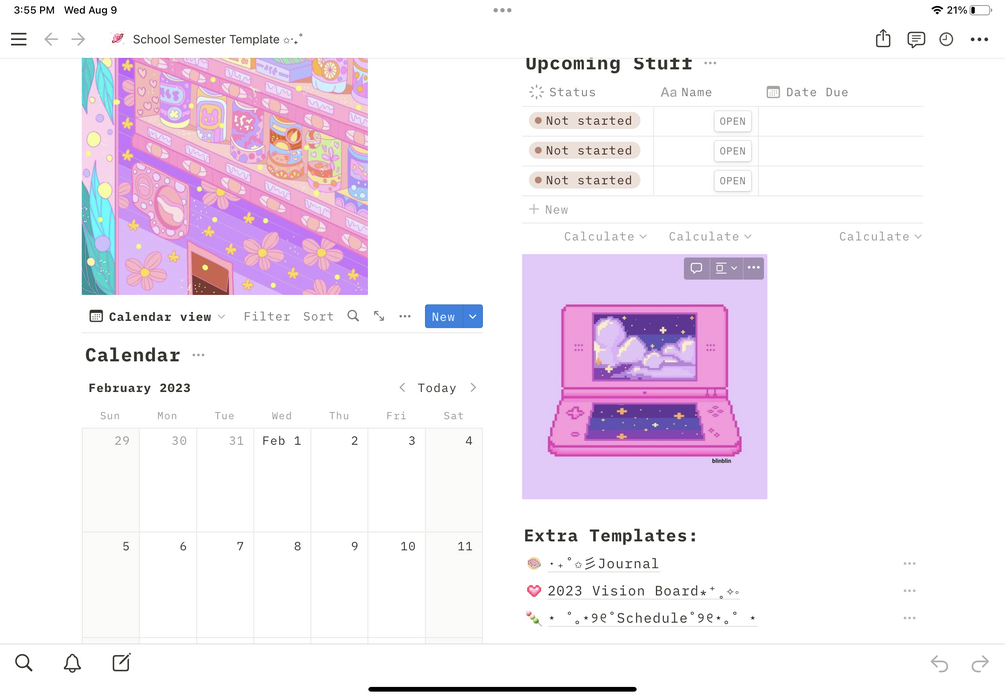 I decided to share my pink/futuristic Notion template theme with you all :) This is preferably used for semesters of school curriculums; however, you can customize it as much as you want. This template is mainly for people who aren't familiar with Notion and I'm willing to start them off with a cute, eye-catching template.